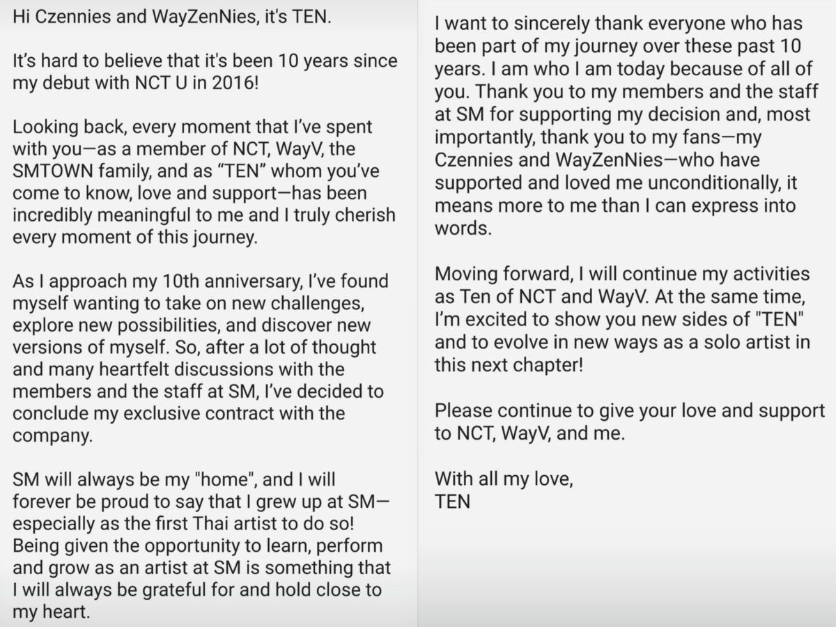 Ο ίδιος ο TEN κυκλοφόρησε μήνυμα στα Instagram stories του, στα αγγλικά, τα κορεάτικα και τα ταϊλανδέζικα. Σε αυτό, ευχαρίστησε τους fans για την υποστήριξή τους κι εξέφρασε πόσο ευγνώμων είναι που του δόθηκε η ευκαιρία να βρίσκεται στην SM.