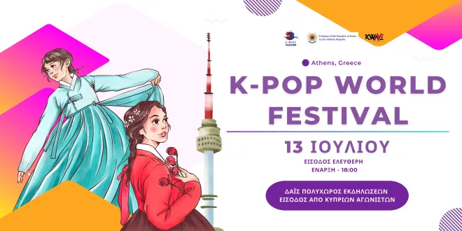 Το K-Pop World Festival, σε διοργάνωση της πρεσβείας της Κορέας και του K-Wave Greece, επιστρέφει φέτος διά ζώσης μαζί με το K-Wave Night. Το ξεχωριστό αυτό φεστιβάλ που αναδεικνύει την κορεάτικη κουλτούρα, θα διεξαχθεί στις 13 Ιουλίου 2024, στον Πολυχώρο Δαΐς (είσοδος από Κυπρίων Αγωνιστών). Αναμένουμε με μεγάλη ανυπομονησία τα performances των διαγωνιζόμενων σε τραγούδι και χορό, καθώς και τις εκθέσεις καλλιτεχνών που εμπνέονται από τον πολιτισμό της Κορέας.